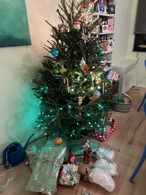 The past couple of years the price of trees has been astronomical, so we haven’t bought a tree since 2020, when I paid $45 for a 4-footer. In 2021 we went to a place in Kingston, where we’d been visiting friends and got a bunch of free branches, the cut-offs from big trees and Danusia made some kind of green arrangement on the wall. We did the same last year with local cast-offs.