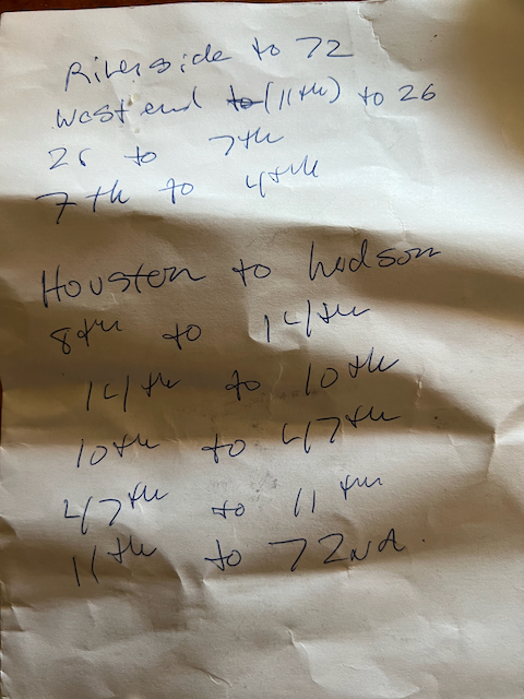 After getting to 7th Avenue, it was smooth sailing. I made a left turn on West 4th and was actually able to answer Tommy’s frantic text messages of “Where are you?” while waiting for a red light somewhere between there and 1st Avenue. “Almost there.” I texted from somewhere around the Bowery.