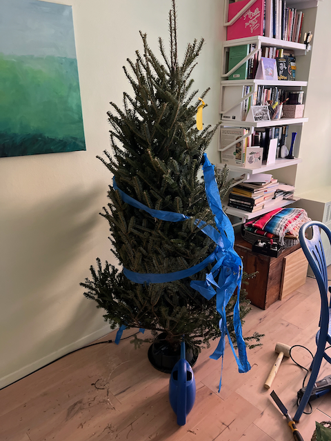 The tree was semi-wrapped up in blue painter’s tape, after all the guy is a professional painter, so it was that much easier to get it into the back of our “Sports wagon,” as the manufacturer likes to call it. I call it “little blue,” since it’s small and dark blue. I had already put the back seats down, so we wrestled it into the car, and I was off to my less stressful trip home. I stopped by a guy selling trees on Hudson Street and bought a green plastic tree stand, I’d thrown away the red and green metal stand we’d had for years when we’d decided trees were too expensive in 2020.