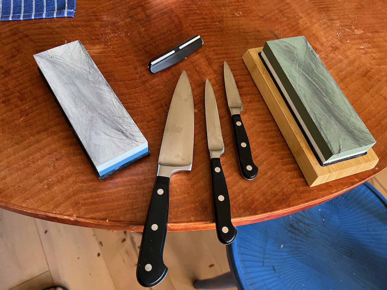 I know a bit more about sharpening now, and our knives cut right through the tomatoes I bought for the test.