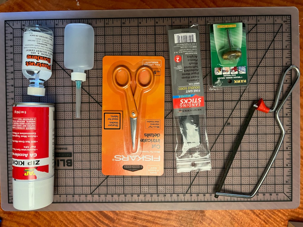 I got, in no particular order, a mini hacksaw. A wire brush for my Dremel. Superglue accelerant. A glue dispenser for the styrene glue.