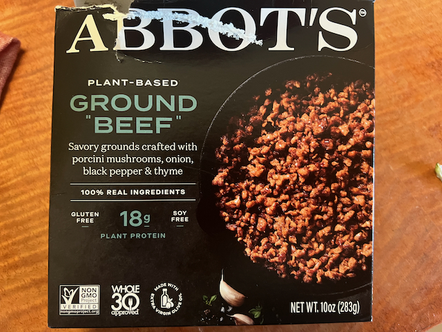 Years ago, in my early recovery days a bunch of us would fellowship after a meeting by going to this place called “The Sanctuary” on First Avenue in the East Village. It was run by the Here Krishnas and vegetarian. Not my first choice but since I was sad and lonely and needed company, I bit the bullet and went along. After all I’d probably had meat for lunch or breakfast, and it wasn’t going to kill me not to have meat for dinner. The Sanctuary was where I discovered Tofurkey. Not exactly like a nice greasy turkey thigh but it didn’t make me throw up and it was chewy enough. But only for special occasions. Last week I was in Whole Foods, and I decided to check out what kind of meat substitutes they had. There’s tofu, of course, but what else? I’ve heard of the Impossible burger, so I looked at what’s in the box. When I read “methylcellulose, cultured dextrose and Food starch modified” among a dozen other ingredients I wondered jus how much better than meat a highly processed substitute is. I give the Impossible burger a pass. I found something called Abbot’s plant-based ground beef, and reading the label there was nothing modified or methylled, just plain natural ingredients, so I figured I’d give it a try. I was pleasantly surprised, the texture was almost exactly the same as ground beef, and the taste decent. And it cost just as much as real meat! Imagine that!