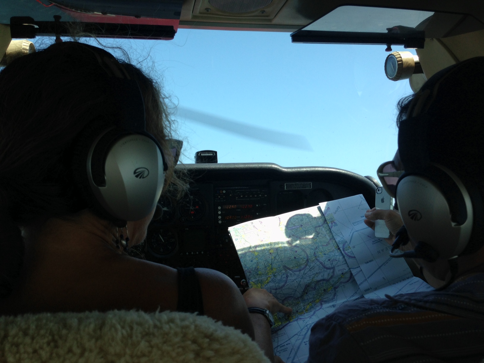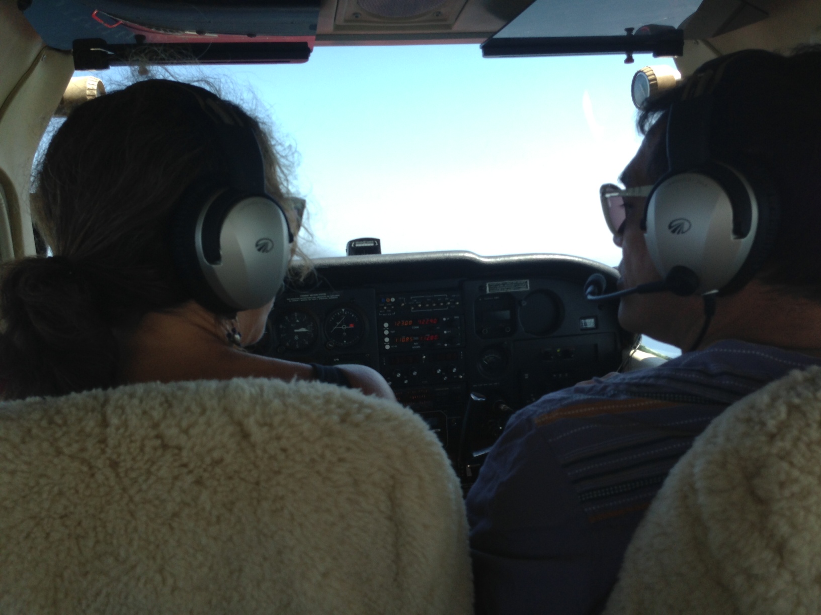 We got on the plane, Shari showed us how to strap in, and we all put our head sets on so we could communicate without yelling at each other at the top of our lungs, the way I had to on those other small aircraft flights. Shari turned the key in the ignition, the prop turned over, and after taxiing back to the runway we were off!