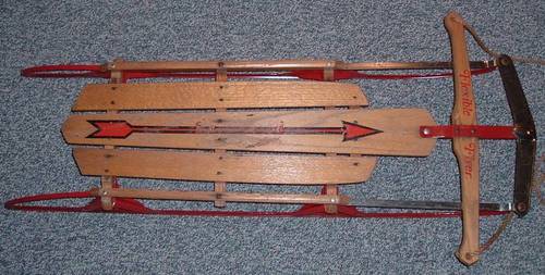 When my son Javier was five years old, in 1992, we were living in Greenpoint, Brooklyn. I was working in a shoe store on East 55th Street, and one day while I was having a smoke break by the service entrance to the building we were in, I watched the porter putting out the garbage. One of the things he tossed onto the pile of black bags was a wooden and metal sled. It was old and worn, and in faded letters it said “Flexible Flyer”, and had an arrow painted on it just in case you didn’t know which way to point it. The Flexible flyer has a little steering bar on it, which controls the separate front-runners, that’s why it’s “flexible.”