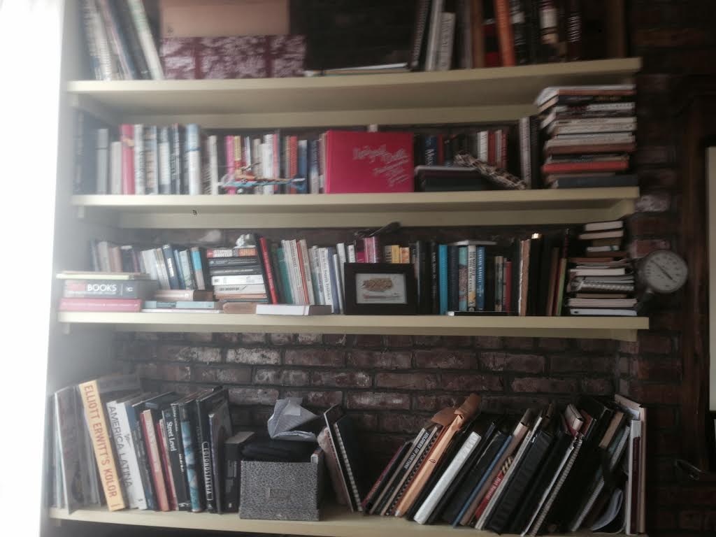 The bookshelves I built into the wall were dusty; I climbed on top of the back of the couch and dusted the shelves, the books, and the remainder of the