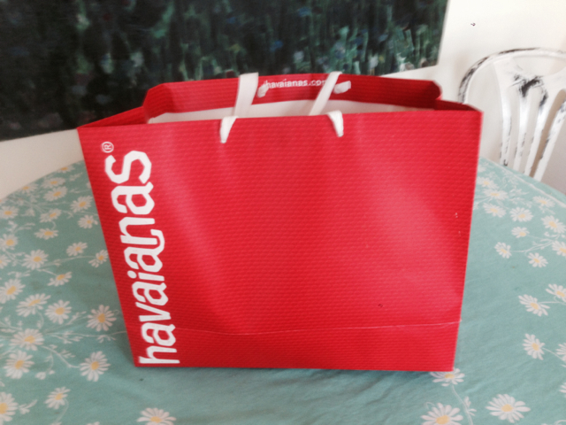 I picked out my flip-flops from the myriad of colors they have (dozens of patterns) and took them up to the register, where I paid the $23.99 in cash. They guy behind the register got a big red bag like this: