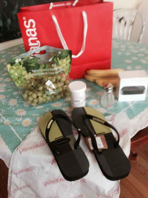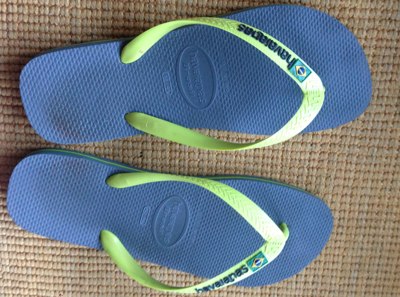 They were already out of the neon green, but I found a pair of dark ones with at least the Havaianas logo in neon green. That’s OK since I’m losing my penchant for being noticed. I do have white ones with the neon green logo but they’re a little dirty. I wear those at home.