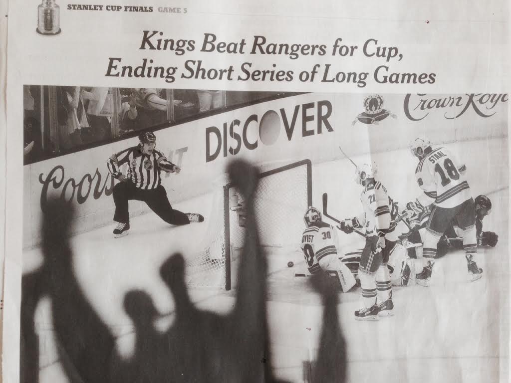In the bedroom I put the TV on, hoping the news would be on, but I had to sit through the LA Kings hoisting the Stanley Cup over their heads one by one as they skated around the rink in front of the delirious fans.
