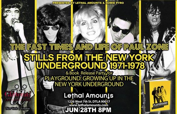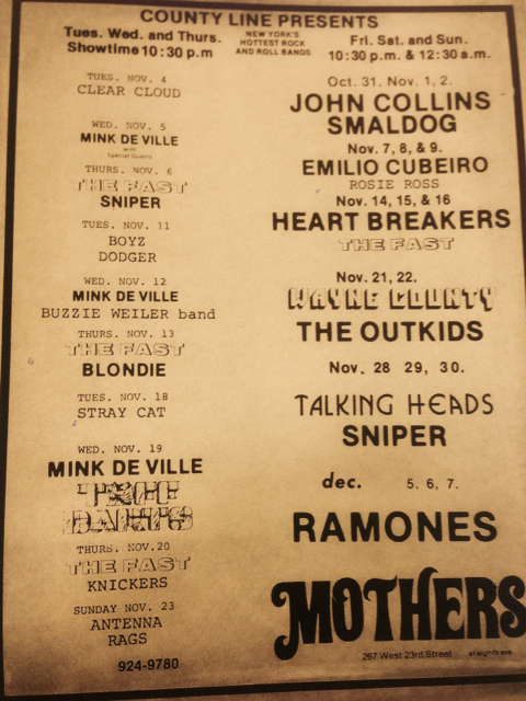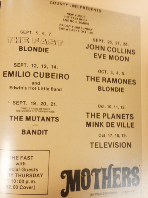 On Mondays the lovely Danusia goes to some kind of spiritual workshop at the West Side Y on 63rd Street. I went once, there’s an early blog post about it if you care to look, and you can understand why I only went once. Of course, if she choses to do so every Monday that’s her choice, isn’t it? I’ve been busy past Mondays, and a few weeks ago the woman who runs the workshop was out of town or something and Danusia stayed home with me, but yesterday it was on again, and I wondered how I should entertain myself, since it isn’t just the workshop, now she’s got a bunch of her girlfriends going and they all want to hang out afterwards and chat. So what used to be waiting till 8:30 or so for her to get home has turned into closer to 11pm. I was thinking of going to a movie, there are two that are new and sound interesting; the new Bernardo Bertolucci movie Me And You, about a brother and sister with their own issues trying to work them out together in a storage locker, and the new Paul Haggis movie Third Person, which did not get a great review but I still like Paul Haggis. The other choice was to stay home and watch TV, surf the internet and eat, what I’ve done the last few Mondays alone’ and that was the last thing I wanted to do. Well, going to the lecture is probably the last thing, but this was close. I ended up going to Barnes And Noble on 17th Street, an old and favorite hang out. When I got divorced 14 years ago this was a place to meet my son Javier on visiting days, and we would spend hours pouring through books in our individual favorite book sections. I used to be really into crime fiction, war novels and spy stories, war history. Javier loved his Dilbert books and the then up and coming Japanese Manga books. I don’t think I can read another war book, there’s a guy in my writing workshop who did a tour in Iraq as an infantry officer and his stories are enough for now, and my interest in Elmore Leonard began to wane after reading 20 or so of his books. I still like Len Deighton and John LeCarré, though. Sometimes at Barnes and Noble I go to the magazine section and thumb through the plastic model magazines, like Scale Aviation Modeler; that’s an old favorite; but last night the magazine section was overflowing with browsers. I went up to the top floor where all the seats are set up for readings, you can sit there and read or do the crossword or just stare off into space if you like and nobody will bother you. I browsed the photography book section and saw a book called: Playground: Growing Up In The New York Underground, by Paul Zone. Paul was one of three brothers who had a band in the early 70’s called The Fast. I remembered The Fast; they were contemporaries of the New York Dolls and played in most of the same clubs at the time. I took the book and sat down to leaf through the pictures, hoping there would be one of me in it. Since I was at many of those clubs and gigs in the early 70’s. I didn’t find any pictures of myself, but I did find the ads pictured above and below, and to give credit where it is due I used my iPhone to snap these from the book, so thank you Paul Zone. In one of the ads, the one at the top of this post, the very first band listed to be playing at Mother’s, a club that was on 23rd Street and 8th Ave is called Clear Cloud. They were friends of mine, and I roadied for them. There was Tony Dunner, the singer from Barbados who called himself the “Black Mick Jagger.” A pair of brothers, John and Anthony Pergamo were the guitarist and drummer. Respectively. Another friend, Michael, who billed himself Mike Lash played bass. Those were different times. I looked at the other bands on those bills, The Ramones, Blondie, Talking heads, Mink DeVille, and none of them were even famous at the time. There were others that never became famous, like The Planets, The Mutants, and of course my friends, Clear Cloud. I remember seeing The Ramones when Tommy was still the drummer. I never saw Blondie, but I did see The Stilettos once, before Debbie formed Blondie. There were other clubs as well, The Coventry out in Queens, Great Gildersleeves right down the block from CBGB’s, Ones, The Reggae Lounge, and even a club in Brooklyn Heights where I saw The Tuff Darts. Tommy Frenzy from the Darts was friends with Anthony, who we all called Ace. The Darts had a song called “All For The Love Of Rock And Roll” and I still remember the lyrics.bottom adRichard-Hell-and-the-Void-001
