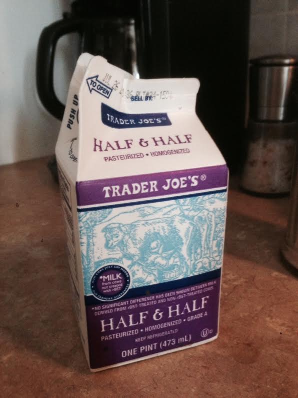 It all comes down to price, and the Trader Joes half-and-half is the least expensive by far, trumping even the Whole Food’s brand that comes in a really neat plastic bottle with a blue cap, cooler looking than the waxed paper cartons of all the other products. I have to get over buying stuff by its visual presentation.