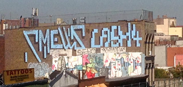 When we first moved in, it had a big PEZ in 6-foot high white letters painted on the side you can see from the Flushing Ave. Station. I’m not a big fan of graffiti, most of it is too sloppy and haphazard to be attractive, but there was something about the neatness of the big block letters that appealed to me.
