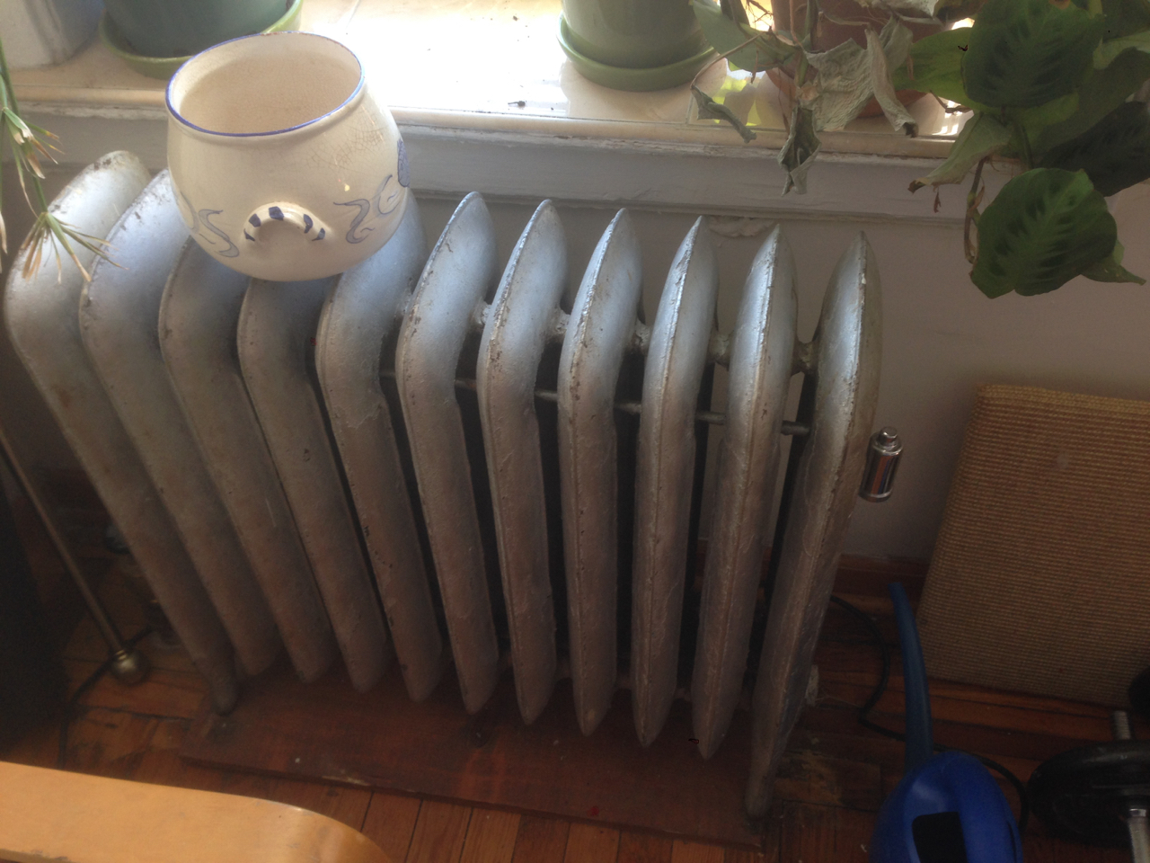 At six as I was in the living room doing my morning ritual of hot Bragg’s apple cider vinegar followed by coffee and a banana and waited patiently for the hissing and banging that announced the heat coming up to my floor. All I got were a few feeble burps and faint clangs from the radiator in the corner of the room. I could hear the wind outside and feel the draft from the edges of the window just inches from my perch on the couch. I got up and put my hand on the radiator, and it was ice cold. I tried the pipe in the kitchen and that was cold too. I went into the bathroom to do the same thing, and almost burned my hand on the pipe.