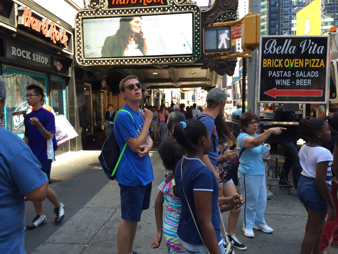 Like a good scout, I looked around for the possibility of a bathroom nearby. On 45th Street and Broadway, there is none.