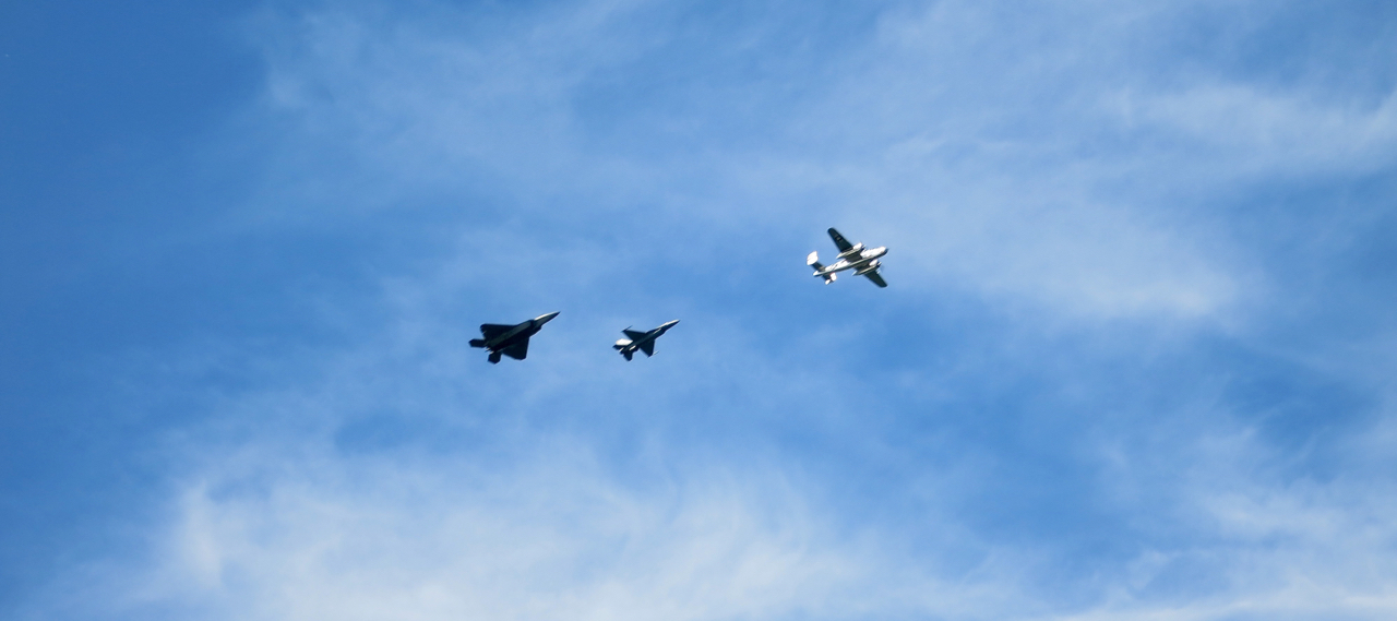 Just in the past few months I’ve seen a flight of three U.S. Army Blackhawks going up the Harlem river, two F-22 Raptors flying over Harlem, a Navy P-2 Neptune flying over the Hudson and just this past Thursday, I saw an F-22 Raptor, an F-16 Falcon, and a B-25 Mitchell W.W.II era bomber flying in formation up the Hudson.