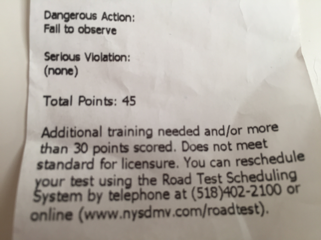 “Your parking and U turn are good, but you hesitated too long on the turns. You drive too slow, and for me I don’t think you are ready for licensing.” He printed out his critique and handed it to me. I looked at it and I had lost 45 points. You can only lose 30 to pass.
