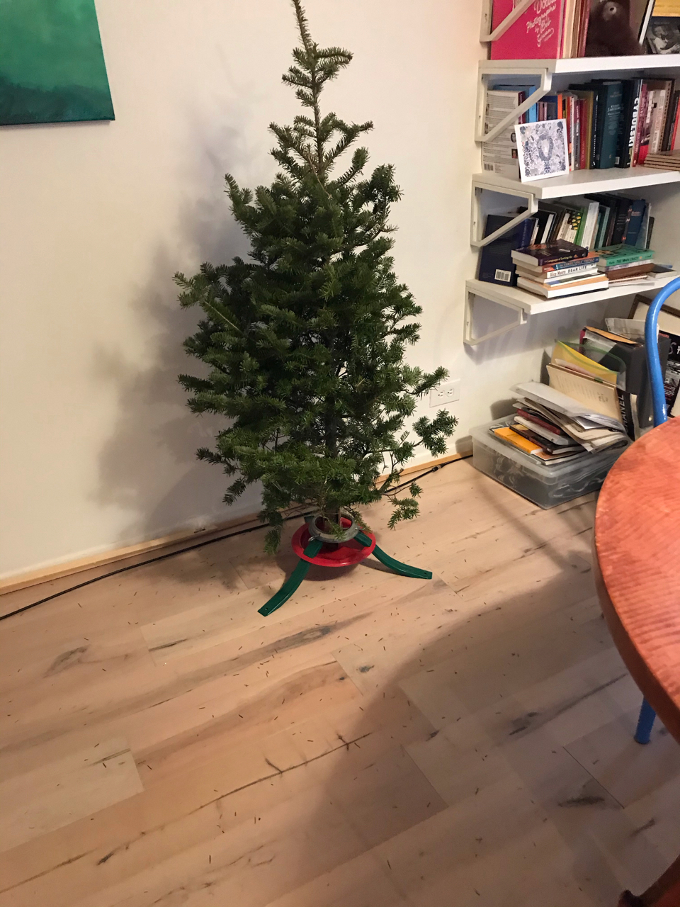 “Yeah, okay, I said, digging out my $43. The guy cut a fresh cut into the tree and put it through the netting wrapping gizmo. I put the tree in my Whole Foods trolley and headed down the hill to the back door of my building.